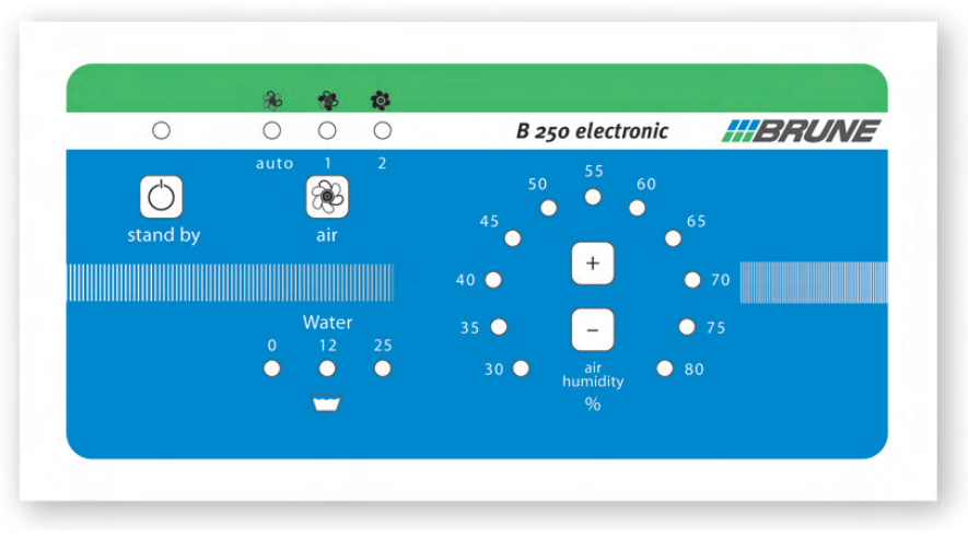 Upravljačka ploča je iznimno pregledna i omogućava neprekidan uvid u stanje i lagano podešavanje uređaja. Moguće je odabrati 3 postavke rada ventilatora. Kad se odabere postavka “auto”, elektronika preuzima sve upravljačke funkcije i prilagođava snagu sukladno potrebama. Ako je velika razlika između postavljene i stvarne relativne vlažnosti u prostoru, ugrađeni ventilator radi većom brzinom. Čim se postavljena vrijednost približi stvarnoj relativnoj vlažnosti, ventilator prelazi na niži stupanj rada. Također moguće je manualno odabrati između dvije brzine vrtnje. Ako uređaj ostane bez vode, automatski će se isključiti. Upravljačku ploču moguće je zaključati da bi se spriječilo nevlašteno podešavanje uređaja.