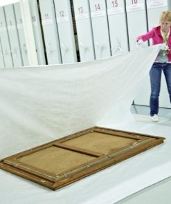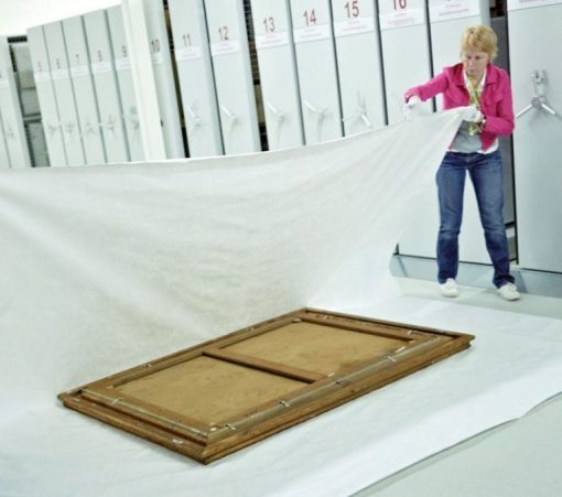 Tyvek fabric is made of pure polyethylene, which combines the best properties of paper, foil and fabric. Thanks to its physical properties, Tyvek is the ideal material for protecting valuable works of art and other cultural assets in museums and archives. It can be used to protect valuable objects during storage in depots, but it is particularly suitable for protecting paintings and sculptures during their transport. Tyvek can be bonded using dextrin and casein adhesives, felts and heat activated adhesives. Tyvek fabric is pH neutral, does not release fibers, allows moisture to escape and protects the artwork from external damage.
